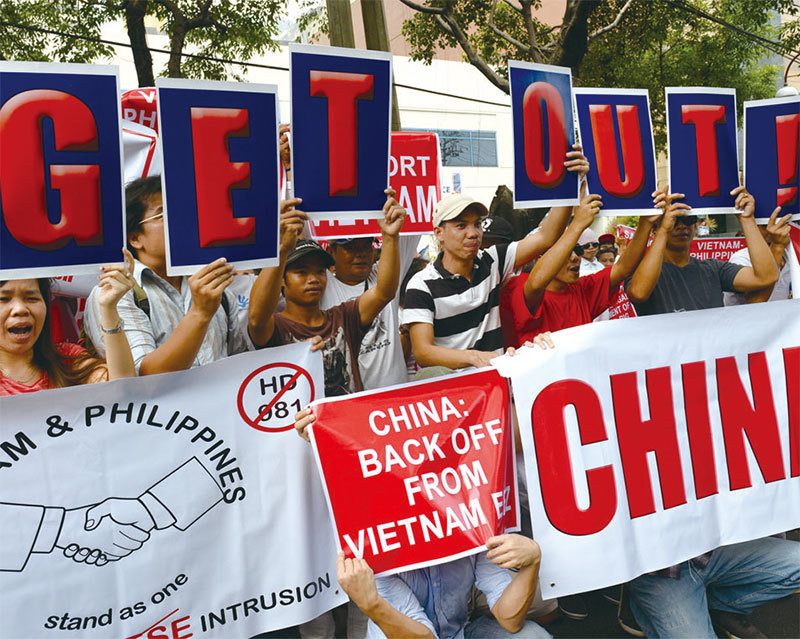 2014年5月16日,數百名菲律賓和越南示威者遊行,要求中共停止在有爭議的南中國海水域進行石油鑽探。(AFP)