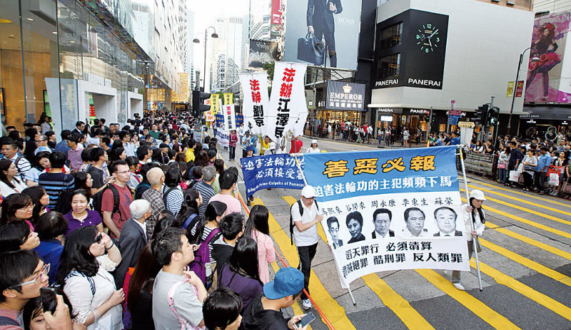 法輪功發言人張而平表示,中國人講「人在做,天在看」,講「善惡有報」,呼籲大家應該制止這場邪惡的迫害,給自己留一個美好的未來。圖為香港法輪功遊行。(大紀元)