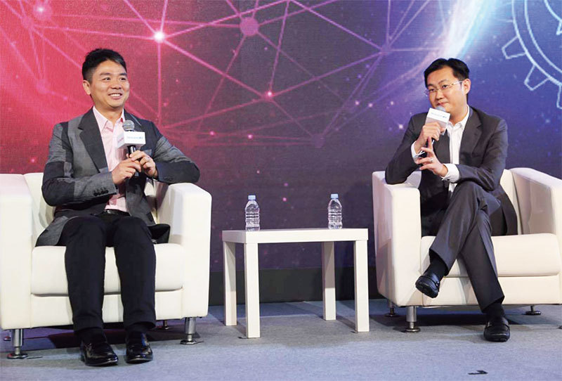 繼整頓金融大鱷後,中共又轉向整頓演藝圈,民間富豪人人自危,近日網上傳出騰訊馬化騰以及京東劉強東到訪延安的照片以求自保。圖為騰訊與京東2015年10月17日宣布戰略合作。(Getty Images)