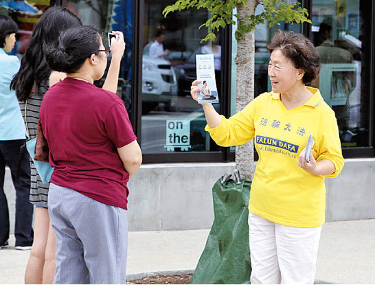 日復一日,越覺得在街上看見那個在打坐的法輪大法學員的那一瞬間有多珍貴。圖為法輪功學員向行人派發傳單。(大紀元)