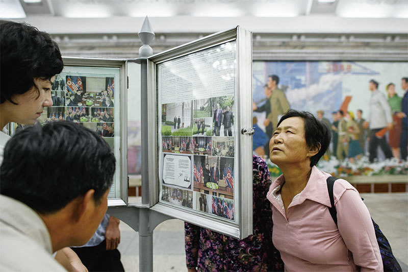 「攻城為下,攻心為上」,川普向金正恩展示了一段視頻短片,展示如果金正恩做出正確選擇後的光明未來。圖為6月13日北韓民眾在平壤地鐵站閱讀報紙上的川金會新聞。(AFP)