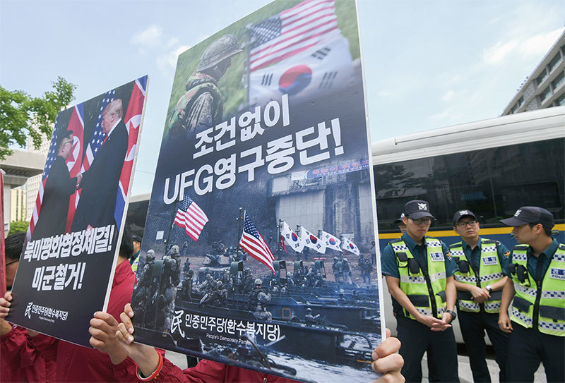 在川金會後的記者會上,川普突然表示會停止「非常具有挑釁性」的美韓聯合軍演,令外界驚訝。圖為6月14日韓國民眾抗議美方將停止軍演。(AFP)