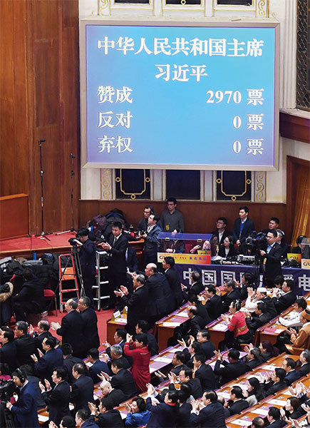 金正恩害怕習近平連任後會一直嚴厲制裁北韓,於是積極求見川普,最後才有了6月12日的川金會。圖為3月17日,習近平連任國家主席及軍委主席。(AFP)