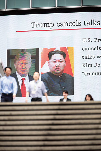 川普5月24日取消川金會,取得了談判的主動權。這種「離開談判桌」的戰術,令「不談的最大」。圖為5月25日,東京街頭巨型屏幕播報相關新聞。(AFP)