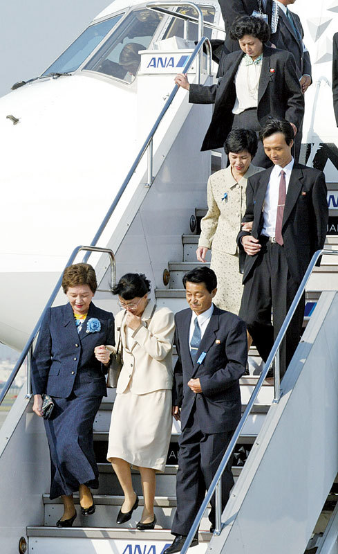 日本首相小泉純一郎與金正日會談後,綁架事件出現急速好轉,2002年10月15日,五名被綁架的日本人乘專機回到日本。(Getty Images)