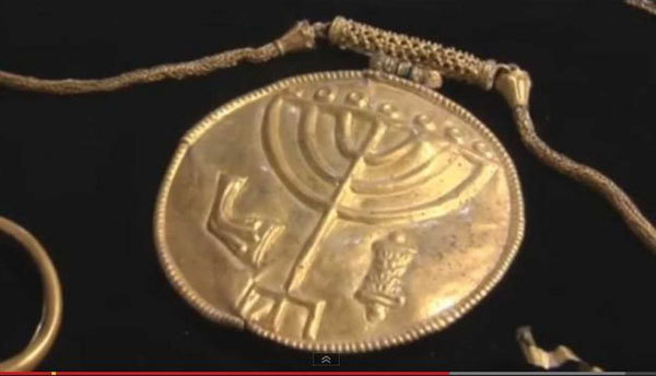 出土的寶藏中有一個直徑十釐米的黃金浮雕獎章,上面刻有象徵猶太人的燭臺、羊角號和一個摩西五經經卷(Torah scroll)。(視頻截圖)