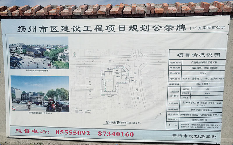 揚州規劃局擬批准在卞寶書宅院內進行廣陵區消防站改造擴建工程項目,並貼出規劃公示牌。(卞世傳提供)