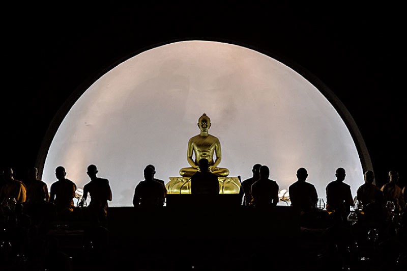 斯坦福大學打坐冥想專家說打坐冥想可能是維持受困洞穴男孩和教練生命的至關重要因素。圖為泰國僧人在佛像前打坐。(AFP)