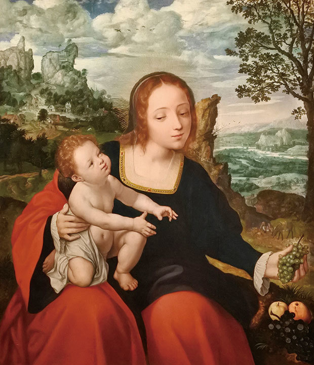 展場中唯一的一幅油畫是16世紀來自荷蘭地區——〈逃往埃及的路上〉(Rest on the Flight into Egypt,約120×105公分),依照策展人說:「這幅畫在當時可能是放在市場上出售的,也可能是在藝術家的工作室櫥窗裡,或是在安特衛普(比利時和荷蘭最重要的經濟和文化中心之一)著名長達六周的展覽會上。」為了加強視覺上的衝擊,畫上的紫色衣服與鑲著金邊顏料都是增添這件作品的價值感。材質顏料的高貴與否,在當時是評價一件藝術品的因素之一。而金色和紫色的顏料屬於貴重的材質。
