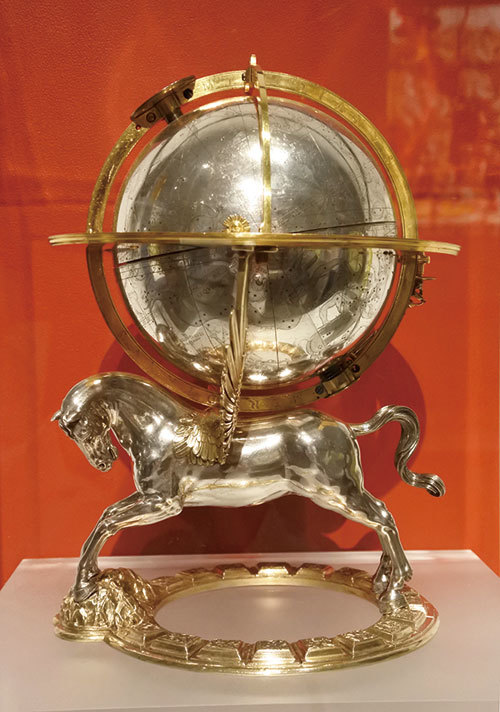 對科學與天文知識的好奇,是16世紀時北方文藝復興的特色,並充分反映在當時帝王收藏的工藝品中。飛馬在伸出的翅膀上,承載著看似失重的地球儀。〈機械地球儀〉(Celestial globe with clockwork),上面刻有星座圖,它將極其複雜的機械技術與美學結合在一起,精巧的工藝結合著對大千世界的好奇。這件屬於神聖羅馬帝國皇帝魯道夫二世的收藏,相對值是100頭牛。