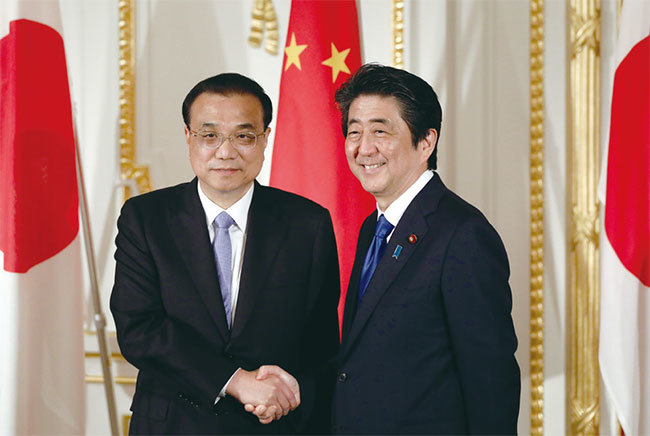 5月安倍晉三會見李克強,表示中日將邁入合作時代。日本政府長期以來陷入「只要加強中日間的經濟合作,就能解決中日在外交、安全保障方面的不安定因素」的錯覺。(AFP)