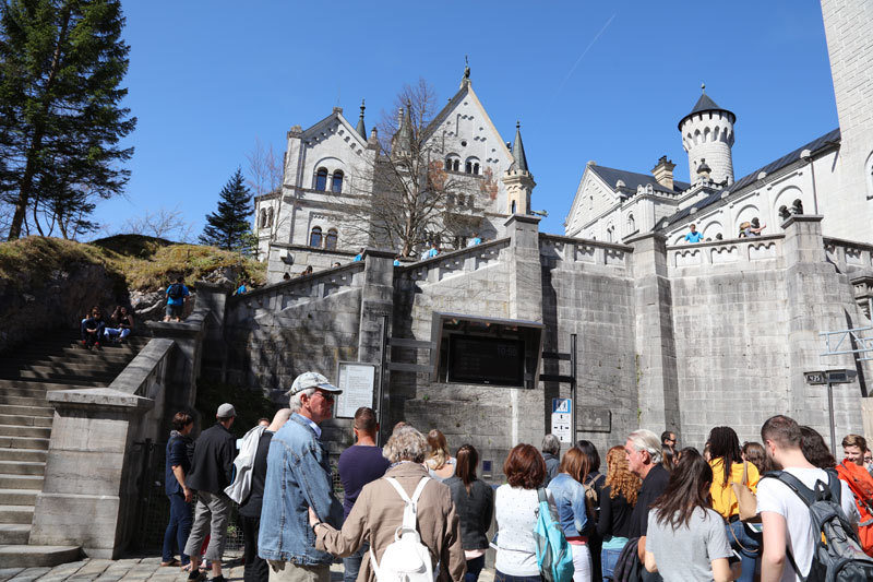 在新天鵝堡入口處,遊客們依照上方螢幕顯示的號碼入內參觀。(攝影/林麗娟)