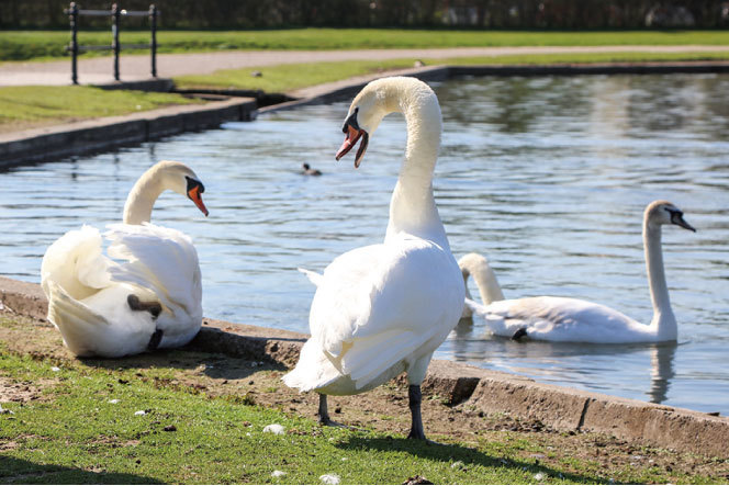 寧芬堡宮前的湖畔的天鵝,一侵略牠的地盤,平時溫柔優美的形象立即轉換唯一副不可侵犯的模樣。(攝影/林麗娟)