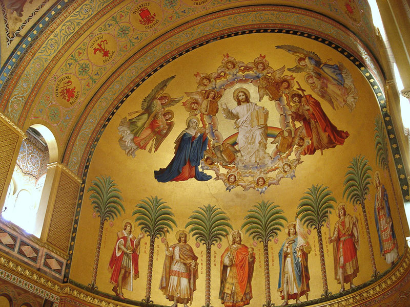 半球形拱頂的加冕殿臺設計寓意教堂的祭壇,表示國王和上帝的連結;來自意大利的卡拉拉大理石階梯引領至殿臺上。殿臺上方半圓頂的金色濕壁畫,六位被封為聖徒的國王有序的圍著弧形排列著,並由繪製於其上的耶穌、聖瑪麗亞和聖約翰加冕。階梯左右兩側的牆上則繪有「十二聖徒」,代表聖法的使者。