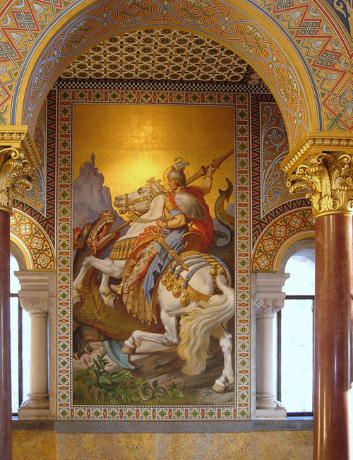 在階梯的對面可以看到一幅畫——〈聖喬治(St. George)對抗巨龍〉。這象徵著基督徒正投身「善」、「惡」之間的對決,其中代表善的一方是聖喬治,而邪惡的代表則是巨龍。另外,有趣的一點是,在畫幅中的左上角背景中有一座遠山,其上立著一座城堡,第一眼看去,它和新天鵝堡極為相似。其實這是國王已經計畫好要動工的第四座城堡,城堡的設計藍圖、道路和水管工程等均已完成,然而隨著國王離奇死亡,所有的工程付諸東流。