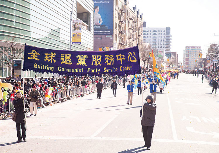 《九評共產黨》發表後,退黨大潮席捲大陸,屯裡超過九成的村民都退出邪黨的黨團隊。圖為2月4日,全球退黨服務中心參加「紐約華人新年大遊行」。(戴兵/大紀元)