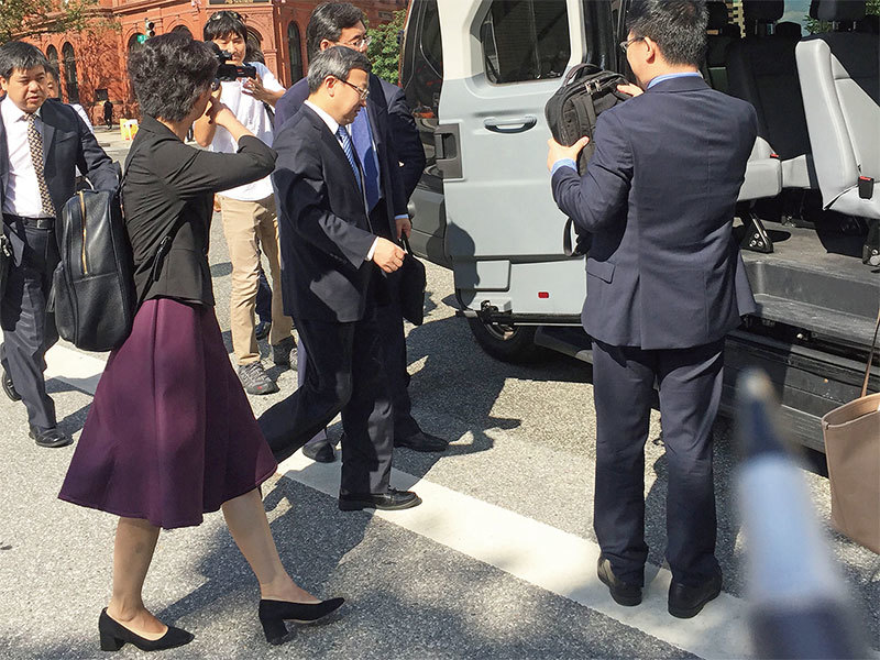 保護美國的知識產權是特朗普總統最關心的選項,中方在這方面堅持錯誤不願改變,中美第四輪貿易會談無功而返。圖為8月23日,中共商務部副部長王受文(圖中)離開美國財政部大樓。(AFP)