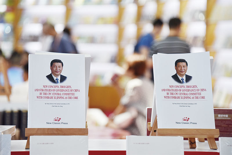 王滬寧是炮製中共理論的「高手」,習近平也需要其提出的新權威主義來鞏固自身權力。圖為8月23日北京國際圖書博覽會展示習近平思想新書。(AFP)