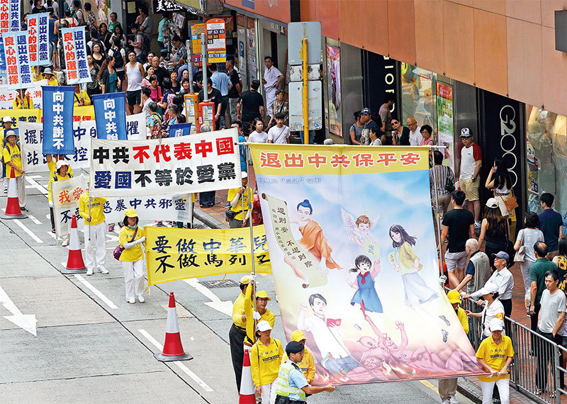 中共正遭遇百年來的最大危機,選擇退出中共組織,就會得救。圖為7月22日香港法輪功大遊行橫幅之一:退出中共保平安。(李逸/大紀元)