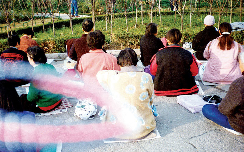 肖靜在學煉法輪功五套功法動作的過程中,就感到身體發熱,被能量包圍著,非常舒服……幾十年無神論的思想瞬間化為烏有。圖為迫害之前,大陸法輪功學員晨煉中的法輪串。(明慧網)