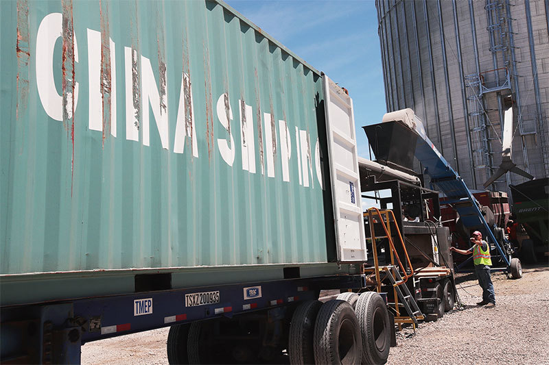 中美貿易戰開戰三個禮拜後,中國不得不恢復從美國購買大豆,因為其他地區無法提供足夠的大豆來滿足中國的需求。圖為6月13日伊利諾伊州豆農裝載大豆。(Getty Images)