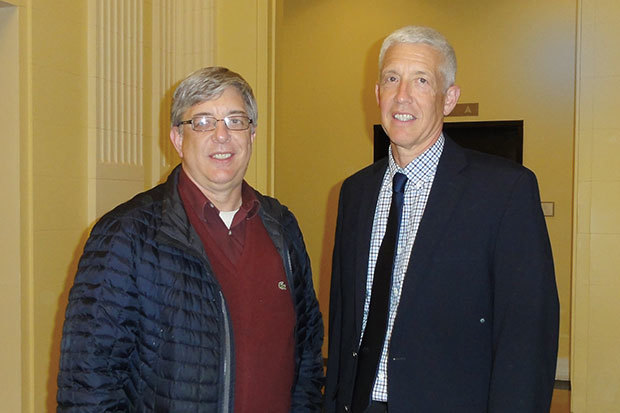 5月6日下午,音樂家兄弟Edgar Cyrus(左)和Tony Cyrus(右)一同觀看了神韻北美藝術團在緬因州波特蘭默瑞爾劇院的第二場演出。(攝影/蘇菲)