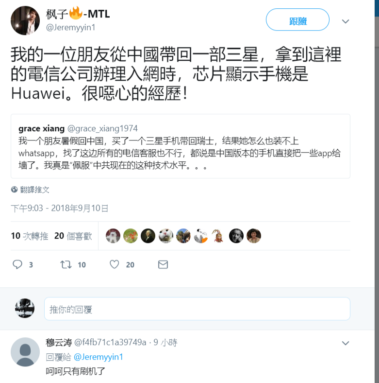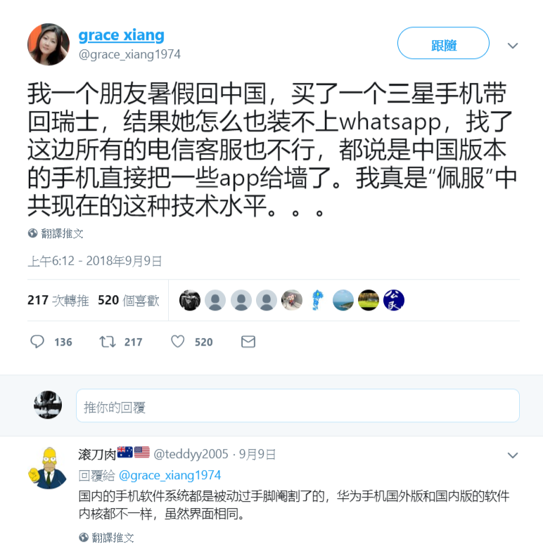 推特上名為「grace xiang」的網友發文稱,「我一個朋友暑假回中國,買了一個三星手機帶回瑞士,結果她怎么也裝不上whatsapp,找了這邊所有的電信客服也不行,都說是中國版本的手機直接把一些app給牆了。我真是“佩服”中共現在的這種技朮水平。。。」