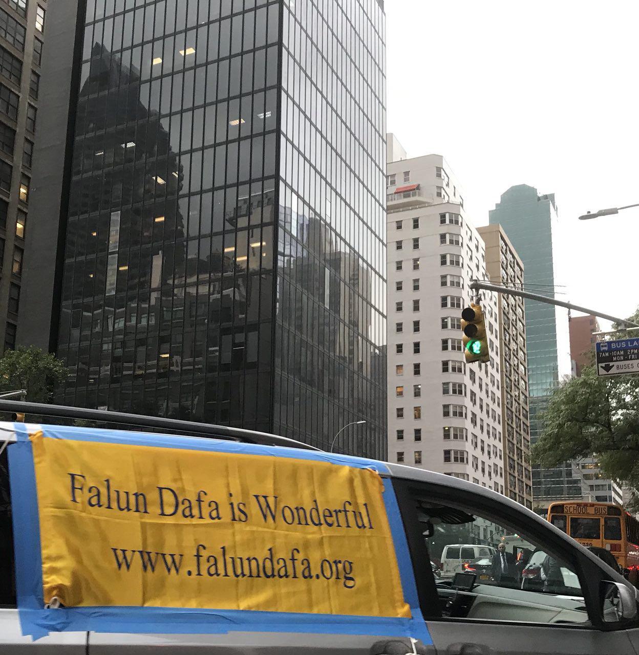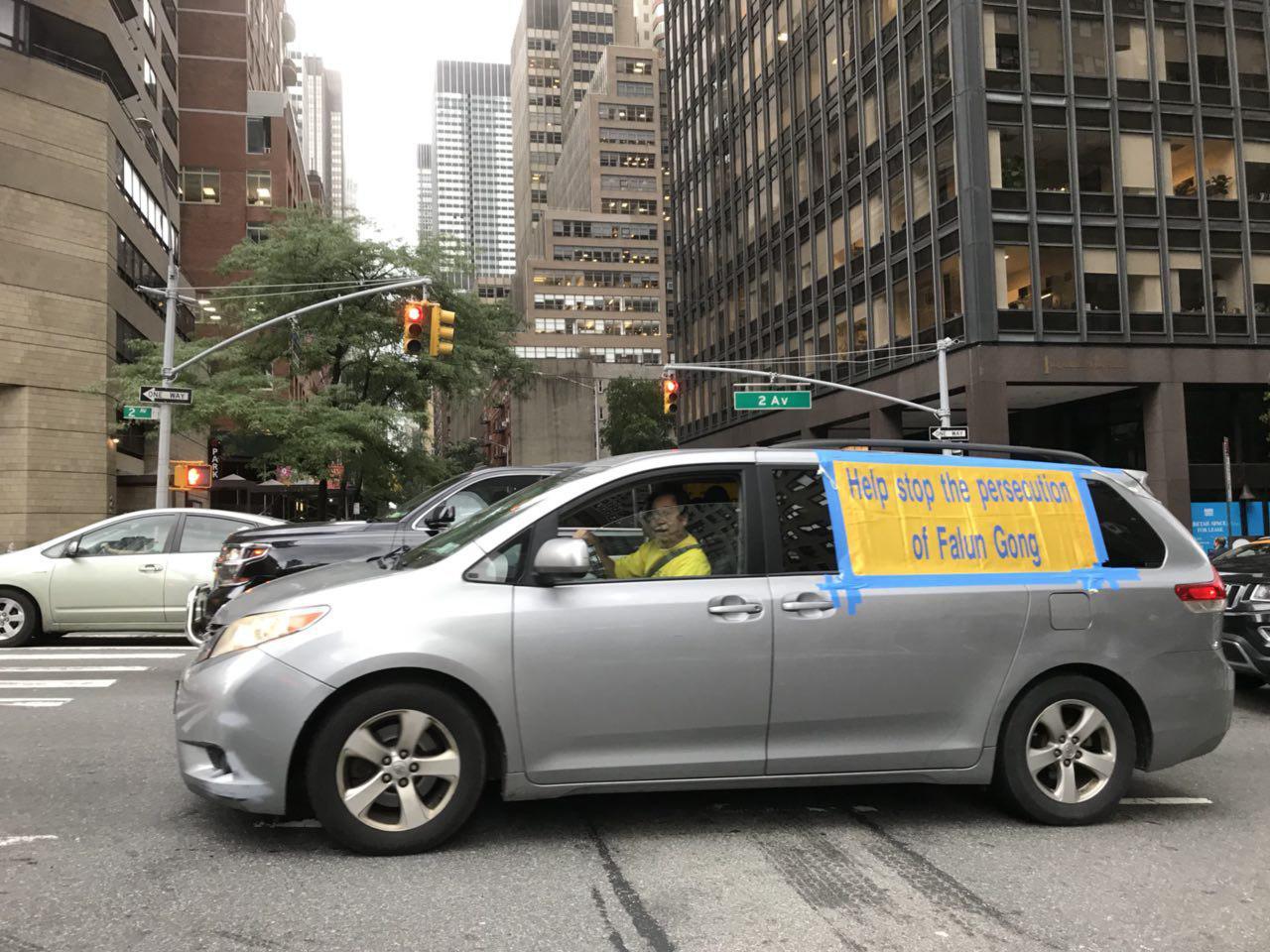 在曼哈頓聯合國大樓附近,車水馬龍不時會傳來陣陣警車鳴笛聲,車流中也會看到法輪功學員用不同形式傳遞停止迫害信息。