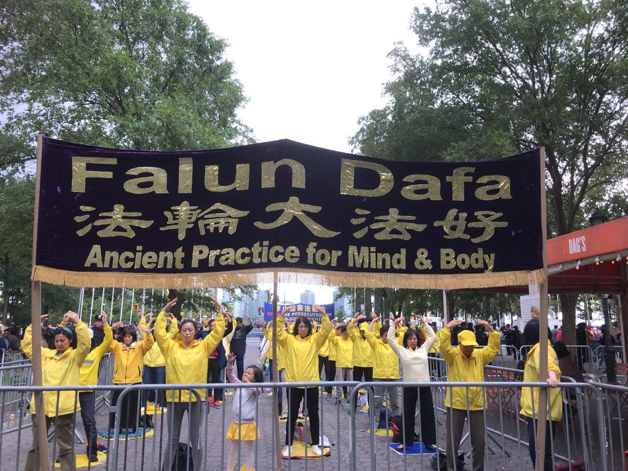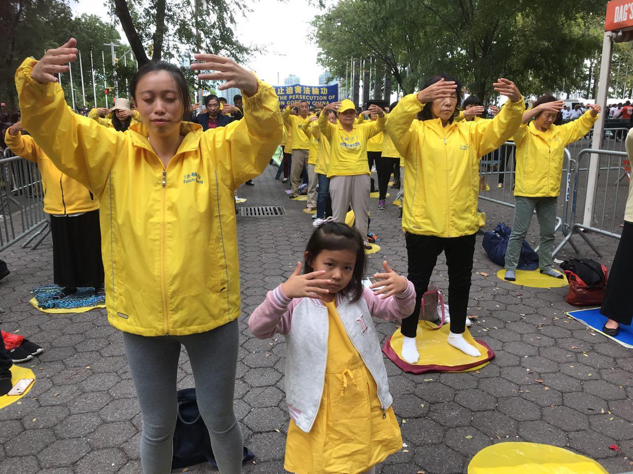 二零一八年九月二十七日,在紐約聯合國總部附近曼哈顿第二大道47街的联合国公园里,法轮功学员無論滂沱大雨、還是秋風瑟瑟,你都會看到静静地炼功、身穿黄色炼功服的法輪功學員,在他们的身边周圍竖立着标语橫幅,傳遞他们这次活动的主题:「制止中共迫害法輪功」、「法辦江澤民」、「法輪大法好」。
