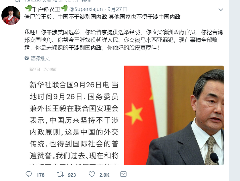 對此,網友「千戶錦衣衛」發推特文批,「你干涉美國選舉、你給普京提供選舉經費、你收買澳洲政府官員、你挖臺灣邦交國牆角、你幫金三胖奴役朝鮮人民、你窩藏馬來西亞罪犯,現在事情全部敗露,你是赤裸裸的干涉別國內政」