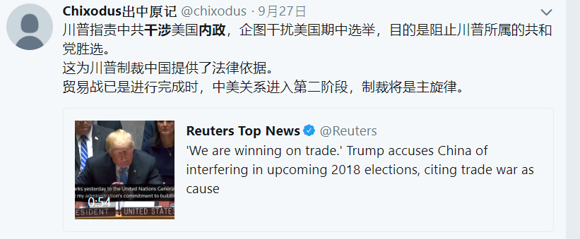 路透也報導稱,川普指責中共干涉美國內政,企圖干擾美國期中選舉,目的是阻止川普所屬的共和黨勝選。