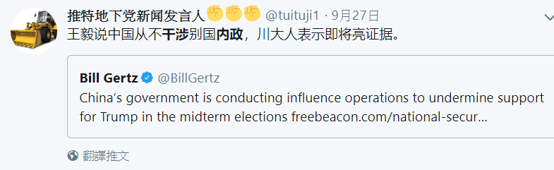 經過帳號「川普中文同步推」的「翻譯」,「中(共)國(政府)在得梅因紀事報和其他報紙上刊登(洗腦)宣傳廣告,(並讓它們)看起來像是新聞。 那是因為我們在貿易和開放市場上正在擊敗他們,(我們的)農民將在這一切結束之後收穫頗豐!」
