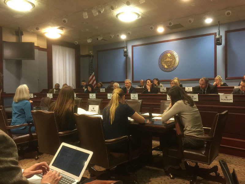 2017年2月8日,安恩.科森(前排左一,藍衣者)在賓州眾議院健康委員會聽證會上,介紹中共活摘器官的情況。3月13日,該委員會全數通過了要求中共停止強摘器官的27號決議案。(莉雅/大紀元)