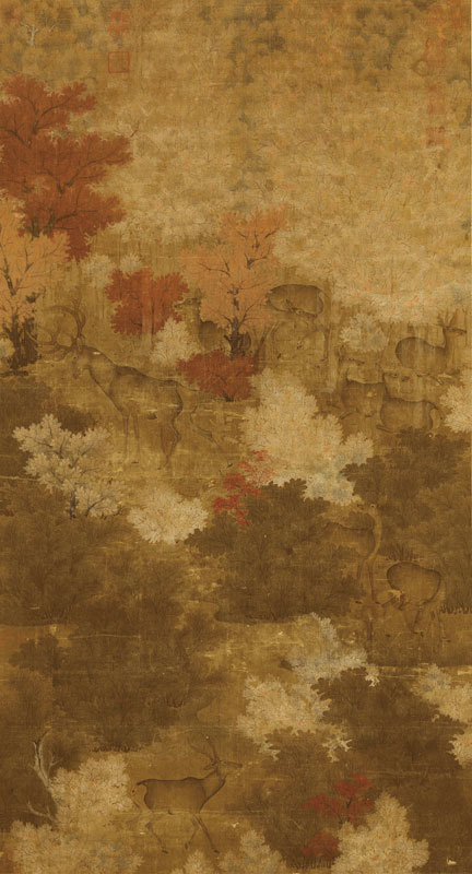 這是一幅沒署畫家名號的瑰麗秋林圖──〈秋林群鹿圖〉,2012年核定為國寶,畫風古意盎然,被認為是十世紀後半,遼代繪畫之代表作,現藏臺北故宮博物院。
