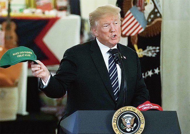 中共出資在愛州刊登插頁廣告,試圖破壞農民支持特朗普,干涉美國的選舉。圖為2018年7月特朗普在白宮發表演說,手持「讓我們農民再次偉大」的帽子。(Getty Images)