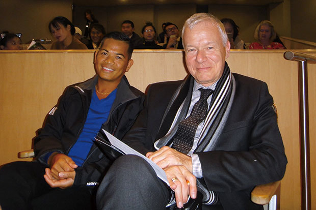 加拿大最知名百貨連鎖店Hudson's Bay副總裁Richard J. Montgomery(右)和朋友觀賞了神韻交響樂團的演出。(攝影/滕冬育)