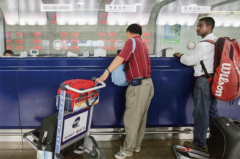 美國財政部10月17日公布的最新報告,並未將中國列入「匯率操縱國」,特朗普再對中國釋出善意。圖為北京機場幾個銀行櫃檯顯示出國際貨幣匯率。(AFP)
