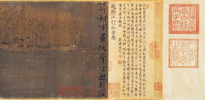 五代十國的南唐雖是一小國,短短幾十年間歷經三個帝王的統治,但其位處江南富裕之鄉,加上從北方逃避政局與戰火的貴族侯門帶來新的文化元素與衝擊,留給後世除了兩位帝王成就極高的文學詞作,還有周文矩的人物畫〈重屏會棋圖〉和顧閎中的〈韓熙載夜宴圖〉。存於故宮的這兩幅畫是繪製於五代還是後人的仿製,眾說紛紜;而幾乎沒有人懷疑趙幹的〈江行初雪圖〉是否為後人所作,因為畫上李煜獨有的錯金刀題字及十幾枚赫赫收藏者的印章,猶如此畫的「黃金保證書」。