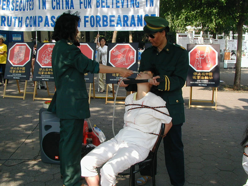 中共採用上百種酷刑,逼迫法輪功學員放棄對「真、善、忍」的信仰。圖為2004年6月24日法輪功學員在紐約聯合國總部前演示中共酷刑之一:野蠻灌食。(明慧網)