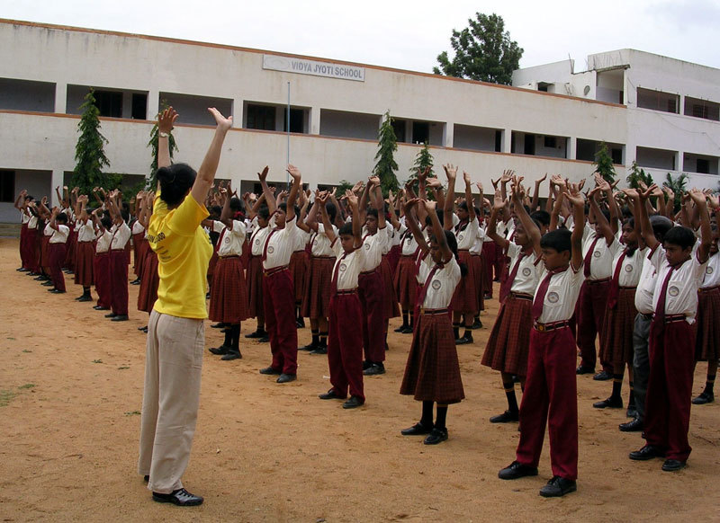 印度第三大城班加羅爾有80多所學校的師生煉法輪功。有些學校超過3000名學生,他們在體育課上集體煉法輪功。(明慧網)