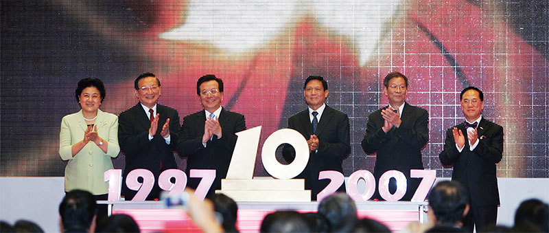港澳歷來是江派曾慶紅的勢力地盤,鄭曉松在習近平抵達前突然死亡,或是曾慶紅給習近平的「當頭一棒」。圖為2007年6月27日曾慶紅(左三)出席香港回歸十周年活動。(Getty Images)