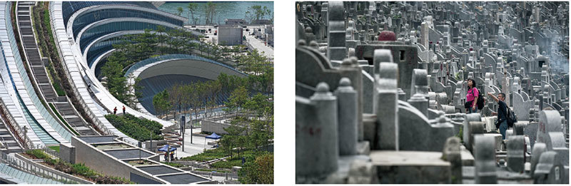 今年9月底開通的香港西九龍高鐵車站(左),外表看似時髦,但香港民眾指出,這個高鐵車站的造型酷似香港墓地(右),非常觸霉頭。(AFP)