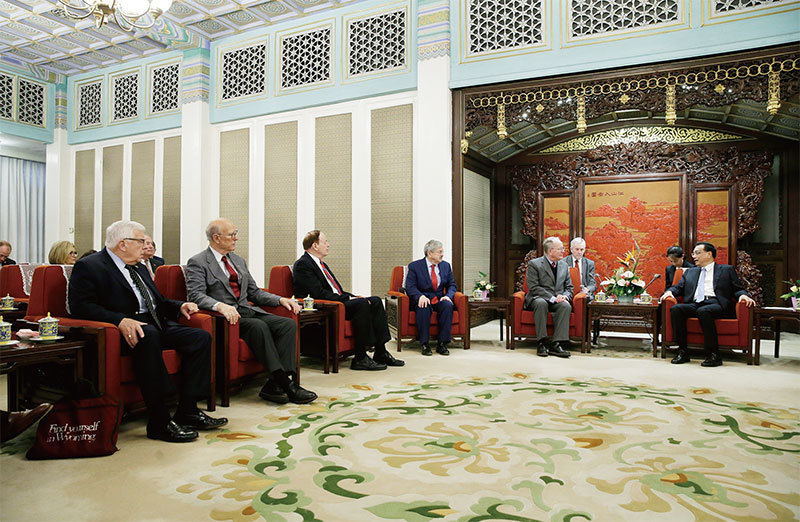11月1日下午,李克強(右一)在北京會見美國參、眾兩院訪中代表團,表示願通過「平等對話協商」管控和解決分歧。(AFP)