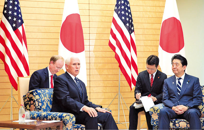 彭斯10月4日發表了對中戰略大轉變的講話,11月13日訪日會安倍,探討的議題包括北韓完全非核化問題,兩人一致同意,聯合國安理會對北韓所做出的決議要完全履行。兩人也同意,在自由且開放的印度太平洋構想之下,美日要緊密合作。美日兩國要加強在第三國進行高品質的基礎建設、能源、數位領域的合作。