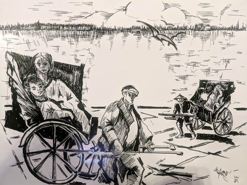 但翻開第二頁的圖畫,展現的卻是吳氏家庭翻天覆地的變化。那是由已故廣告設計師、藝術家維格諾拉(Dominic J. Vignola)根據好友吳昌寧的回憶而畫的速寫:遼闊的江面上幾隻水鳥划過,在江邊,一位神色不安的女子抱著小孩坐在黃包車上;不遠處,另一輛黃包車正迎面而來。當時,吳管氏帶著兒子到了蕪湖;儘管暫時躲開了日本軍隊,但阮囊羞澀的他們卻已寸步難行。