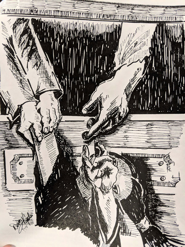 吳昌寧從文件袋裡取出了另一張速寫,上面是一位被一雙強壯的手拉著,吊在火車窗外的女士——這是吳昌寧的母親。