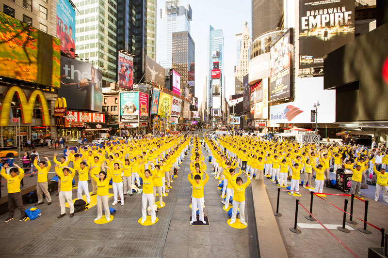 美國紐約時代廣場上,來自世界各地的法輪大法學員集體煉功,展現「真、善、忍」修煉者的風采。(愛德華/大紀元)