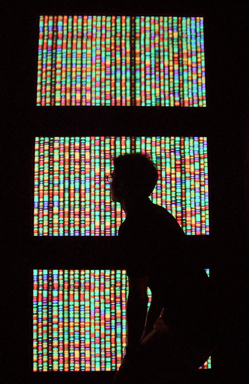 現在科學發現人類與動物的基因有很高的相似度,豬與人的基因有84%同源。一旦豬瘟爆發,病毒變異就易感染人。圖為訪客觀看在紐約市美國博物館的人類基因組圖譜。(Getty Images)