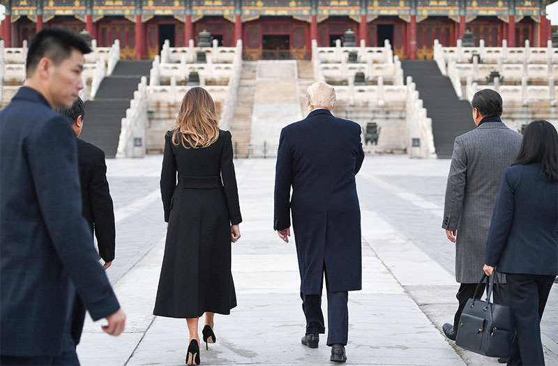 特朗普與習近平談判之前說出「我為此準備了一生」,或傳遞此一信息:將第一次打開中國的大門。圖為特朗普夫婦去年11月8日訪問北京故宮。(AFP)
