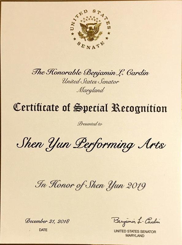 馬里蘭州巴爾的摩演出前夕,馬里蘭州聯邦參議員Benjamin Cardin向神韻藝術團發來的褒獎證書。(大紀元圖片)